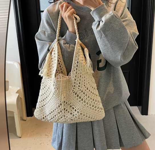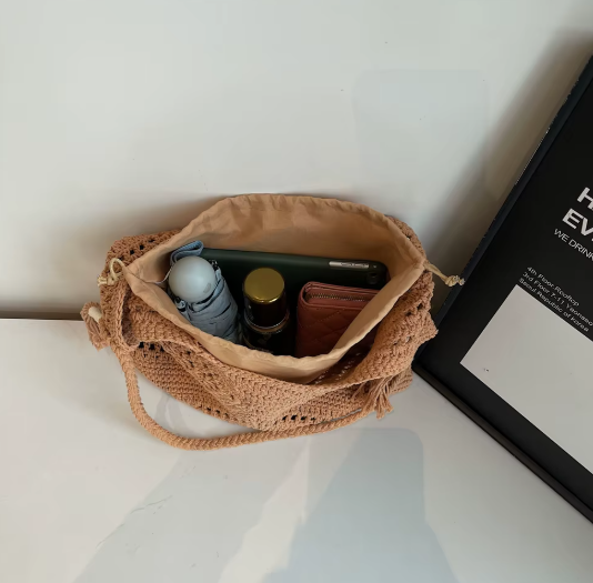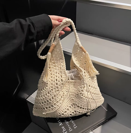 The spacious tote and matching mini pouch offer lightness, versatility and a tactile beauty. Finished with tassel details and a soft drawstring closure, it's more than a bag — it's a quiet statement of effortless sophistication.